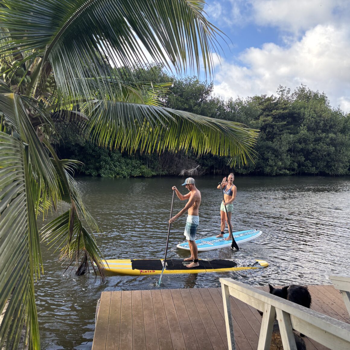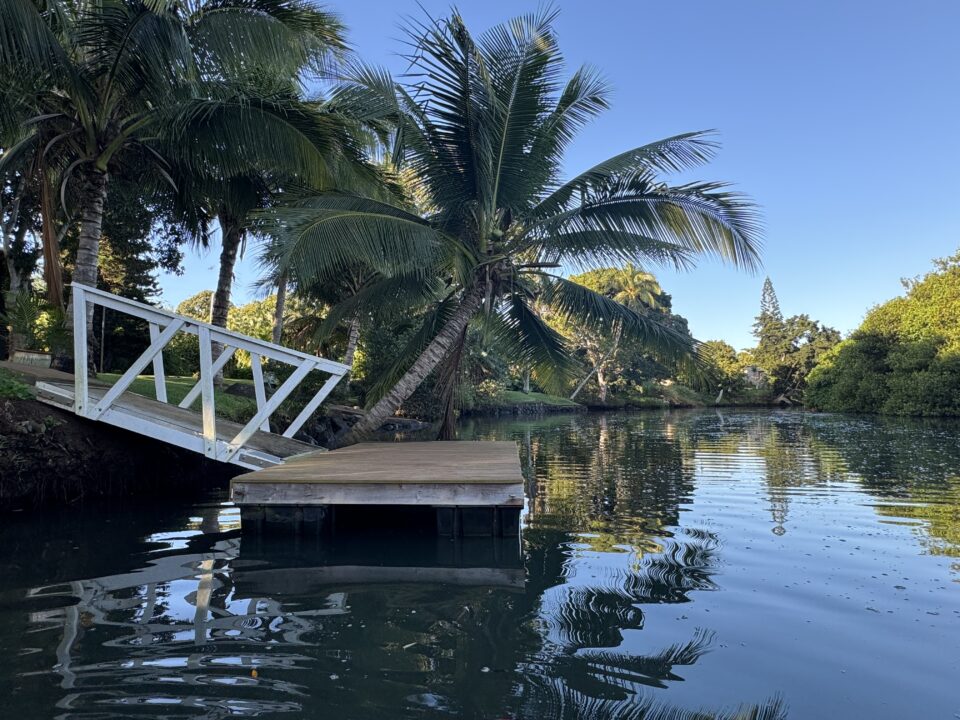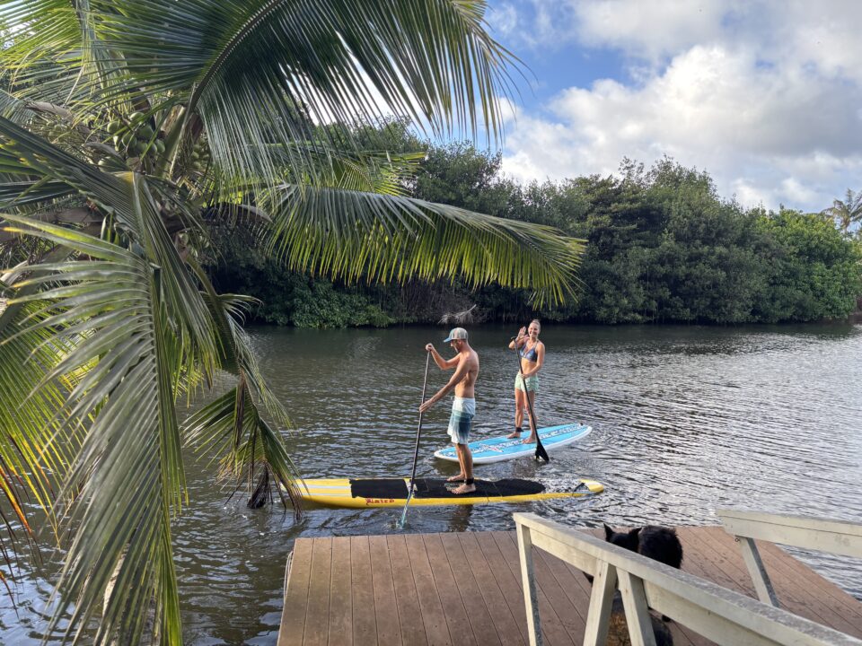 You will be staying at our beautiful Hale (Hawaiian for house) right on the Anahulu river, surrounded by mango, papaya, and coconut trees and a traditional Hawaiian taro pond. The property is only a five-minute walk to Haleiwa, and a ten-minute paddle on a SUP board takes you straight to the ocean. We have our own gym with a variety of equipment for your workouts.